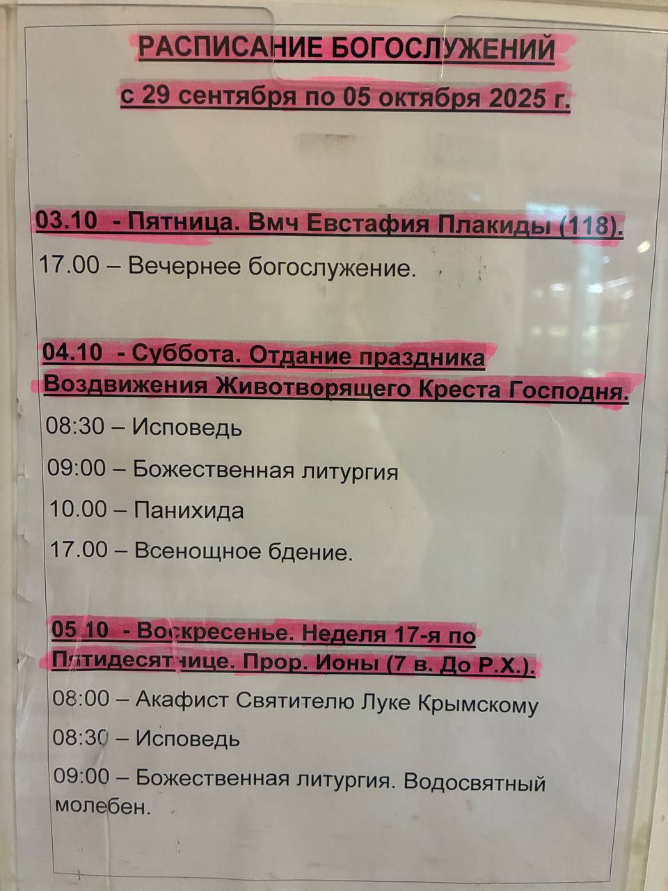 - 5 октября 202522 сентября 2025 (по ст.ст.)ВоскресеньеНеделя 17-я по ПятидесятницеИкона Богородицы «Услышательница» («Зографская») Преподобный Макарий Жабынский, Белевский, иеросхимонахСвященномученик Фока Синопский, епископСобор Алтайских святыхПророк ИонаПреподобный Иона Палестинский, пресвитерБлаженная Параскева ДивеевскаяПреподобный Иона ЯшезерскийСобор Тульских святыхМученик Фока Вертоградарь (Садовник), СинопскийПраведный Петр АфриканскийСвященномученик Феодосий Бразский, митрополитСвященномученик Вениамин (Воскресенский), Романовский, епископБлаговерный князь Иоанн I Данилович КалитаПреподобномученик Киприан Зографский (Афонский)Благоверный князь Михаил Всеволодович, ЧерниговскийПреподобномученик Никон, ученик прмч. Кукши ПечерскогоСвятитель Пимен, архиепископ НовгородскийСвятитель Феоктист Печерский, епископ ЧерниговскийПреподобный Варсонофий ЩегловскийСвятой Иаков Поспелов Святитель Иоанникий РудневСвященноисповедник Василий КинешемскийЛк.24:36–53, 2Кор.6:16–7:1, Лк.5:1–11, Евр.4:14–5:6, Ин.10:9–16